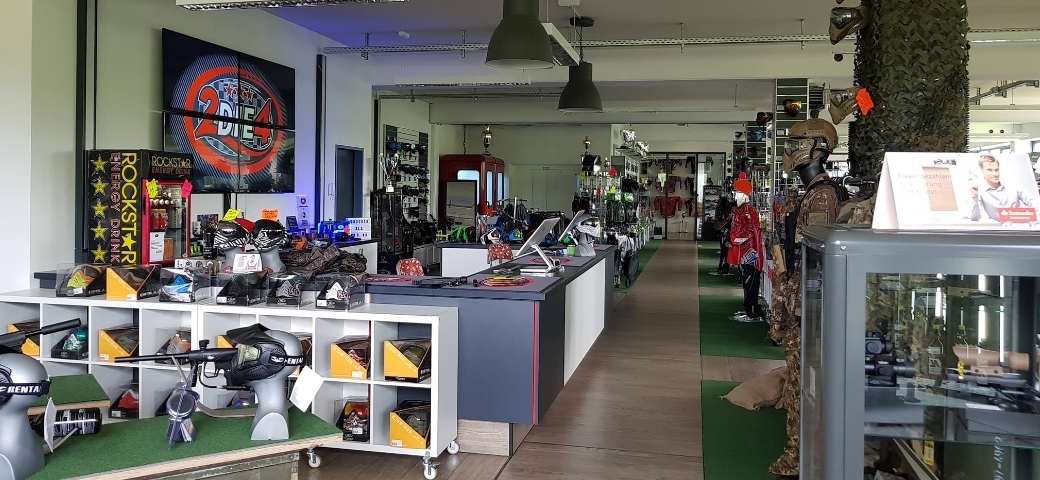 Das gesamte Gebäude wurde 2015 umgebaut und neu gestaltet. Herausgekommen ist der aktuell grösste Paintball Shop Deutschlands. Da müssen selbst wir von Paintball Sports mit unseren immerhin 330qm Fläche ganz schön schlucken. In Sachen Grösse macht 2Die4 auf jeden Fall so schnell kein Wettbewerber etwas vor.