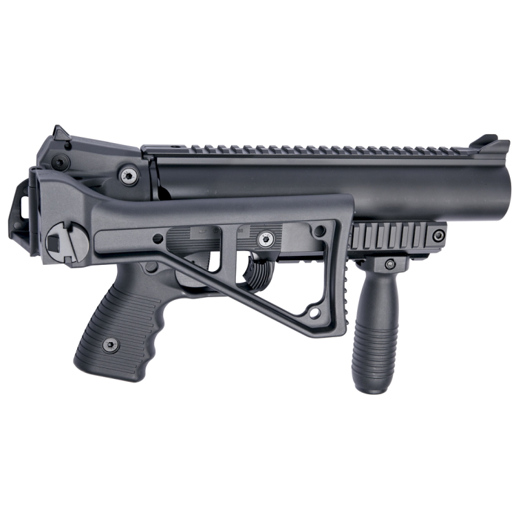 Der B&T GL-06 von ASG ist ein voll lizenzierter Granatenwerfer, der ursprünglich von Brügger & Thomet in der Schweiz hergestellt wurde. Der Schaft und der Receiver bestehen aus Polymer und der Lauf ist aus Metall. Alle vier Seitenschienen sind aus Metall. Ein schnell abnehmbarer Frontgriff vervollständigt den GL-06. Der GL-06-Werfer nimmt Airsoft-Granaten beliebiger Länge auf (Nicht im Lieferumfang enthalten!).