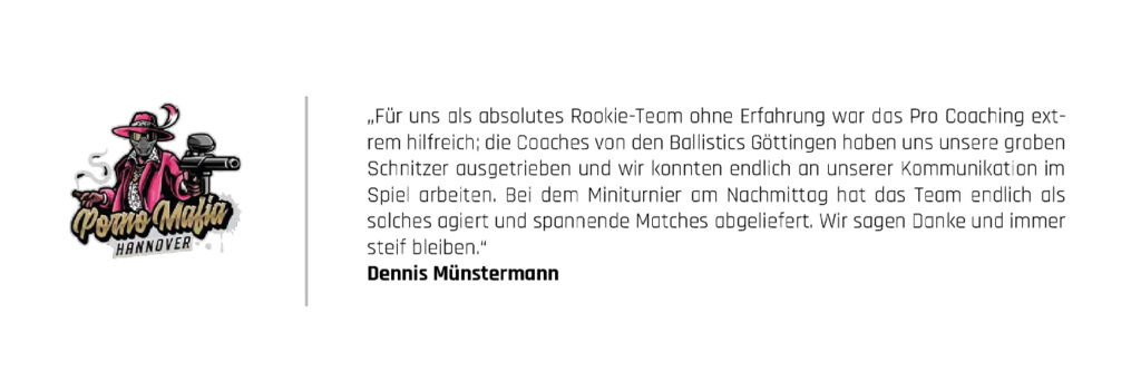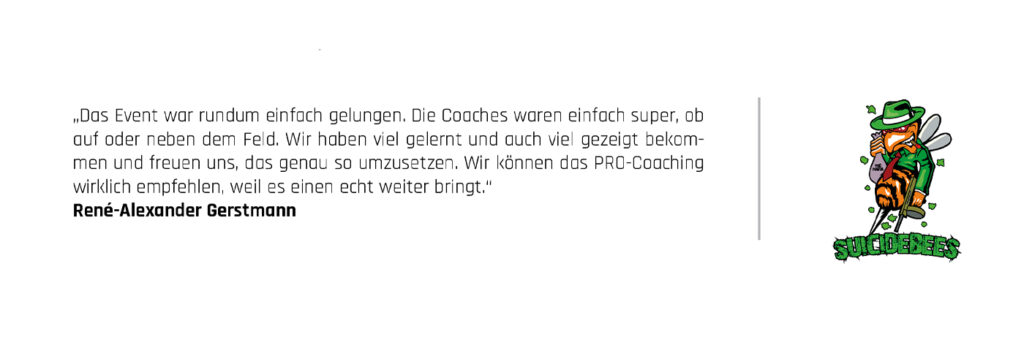 Damit war schlussendlich ein echt starkes Gesamtpaket geschnürt worden, in dem die Teams weder für die Trainer noch für den Eintritt am Feld etwas bezahlen mussten. Lediglich die Trainingspaint musste am Spielfeld gekauft werden. So stand dem ersten PRO-Coaching-Event nichts mehr im Wege und es ging an die Ausschreibung. Sechs Plätze waren maximal zu vergeben. Vier Teams entschieden sich schlussendlich zur Teilnahme. Diese waren die Porno Mafia Hannover, die Suicide Bees, das Team Disturbed Wolfsburg und die Knights aus Braunschweig.