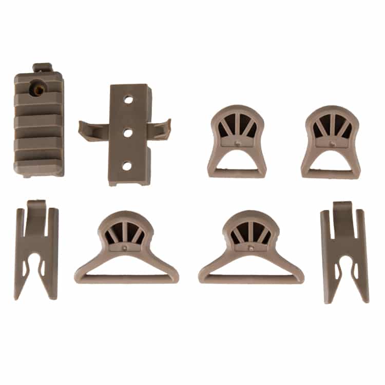 Die seitlich angebrachten Schienensysteme ermöglichen die Anbringung zahlreicher Zubehörteile wie Taschenlampen und Nachtsichtgeräte, so wie man es auch vom Original Helm kennt.