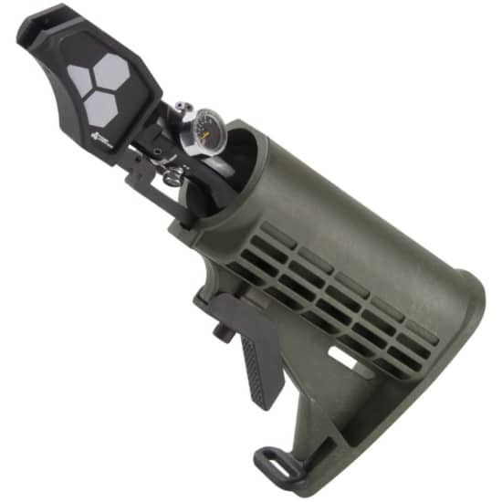 Die Dye DAM Air Stock verlegt die Luftversorgung Eurer Dye Assault Matrix in die Schulterstütze des Markierers und macht aus der DAM somit einen vollwertigen MagFed Markierer. Selbstverständlich ist die Air Stock leicht nach unten versetzt, so das man auch mit Maske hervorragend zielen kann.
