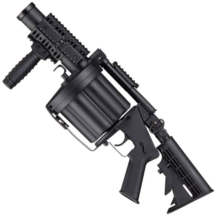 Dieser Granatwerfer ist dem original M203 Granatwerfer nachempfunden, so wie er in zahlreichen Armeen weltweit im Einsatz ist. Er verfügt über eine Trommel die bis zu 6 Stück 40mm Granatenhülsen (nicht im Lieferumfang enthalten) fassen kann die sich nach einander im halbautomatischen Feuermodus verschießen lassen.