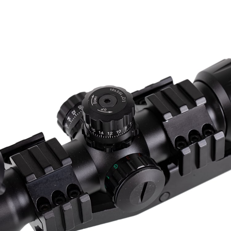– Mil-Dot Rot, Grün oder Blau beleuchtetes Absehen mit 3 Intensitätsstufen