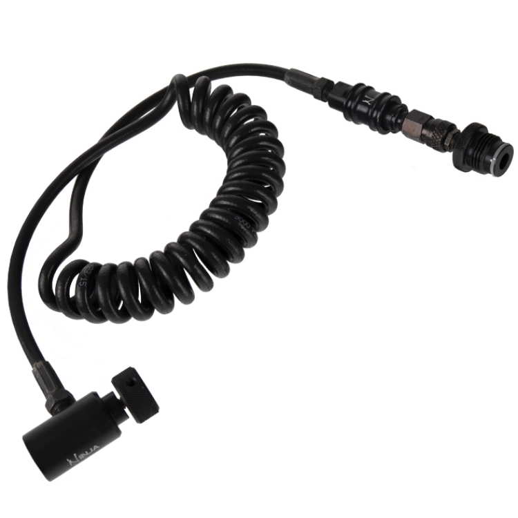 Hochwertiges Paintball Remote System von Ninja Air USA mit Slide_Check Entlüftungsventil. Wenn man das Slide-Check am Schlauchende nach vorne schiebt wird der ASA Anschluss automatisch entlüftet. Schiebt man es wieder zurück, strömt die Luft wieder durch den Schlauch in den Markierer.