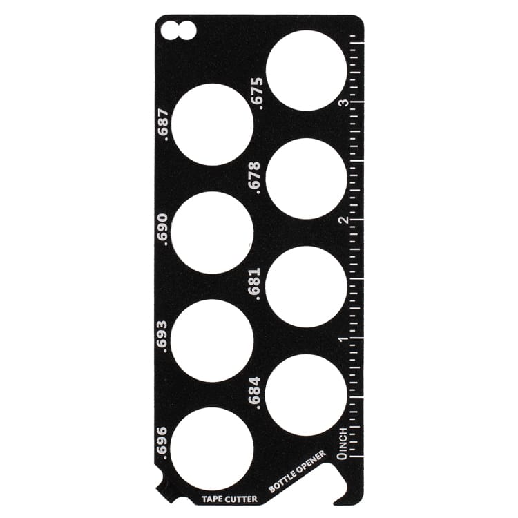 Der Ballsizer verfügt über 8 Mess-Bohrungen mit den Durchmessern .675, .678, 681, .684, .687, .690, .693, .696