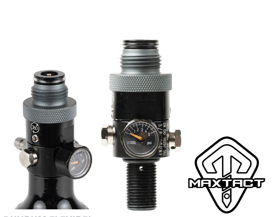 Der MagFed Markierer Hersteller MAXTACT aus Taiwan hat einen neuen Regulator mit stufenlos rotierendem 360 Grad Gewinde-Kopf auf den Markt gebracht. Es ist bereits die zweite Auflage dieses Regulators der sich besonders in der MagFed Szene, wo kompakte, flexible Setups gefragt sind, großer Beliebtheit erfreut. Erhältlich als 200 Bar und 300 Bar Variante in optisch ansprechendem schwarz/grau Finish und mit jeder Paintballflasche kompatibel.
